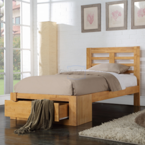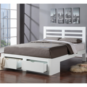 Simplicity is key: It comes flat packed (meaning it’s ideal for those with tighter access spaces) and is available in white, white & oak, or we also have the oak. The single option comes with one drawer, while double and king come with 2 drawers. Please see images.