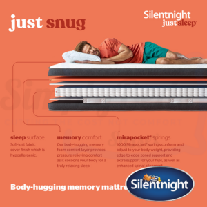 1000 individually responsive pocket springs and energy absorbing memory foam ensure you’ll sleep soundly. Clever zoned springs provide targeted support to the areas that need it most, while the breathable fabric borders allow air to circulate freely throughout the mattress. The hypoallergenic soft-knit fabric sleep surface is designed for both supreme comfort and a refreshed nights sleep. Rolled for easy transportation, even up tight staircases. Non-removable cover.